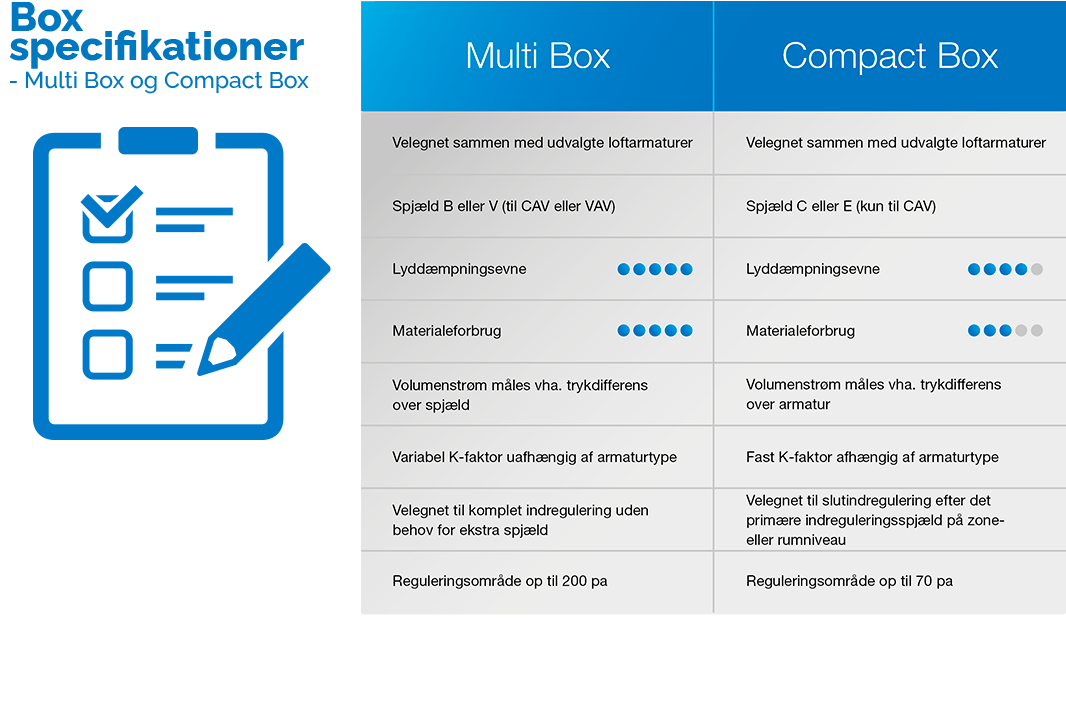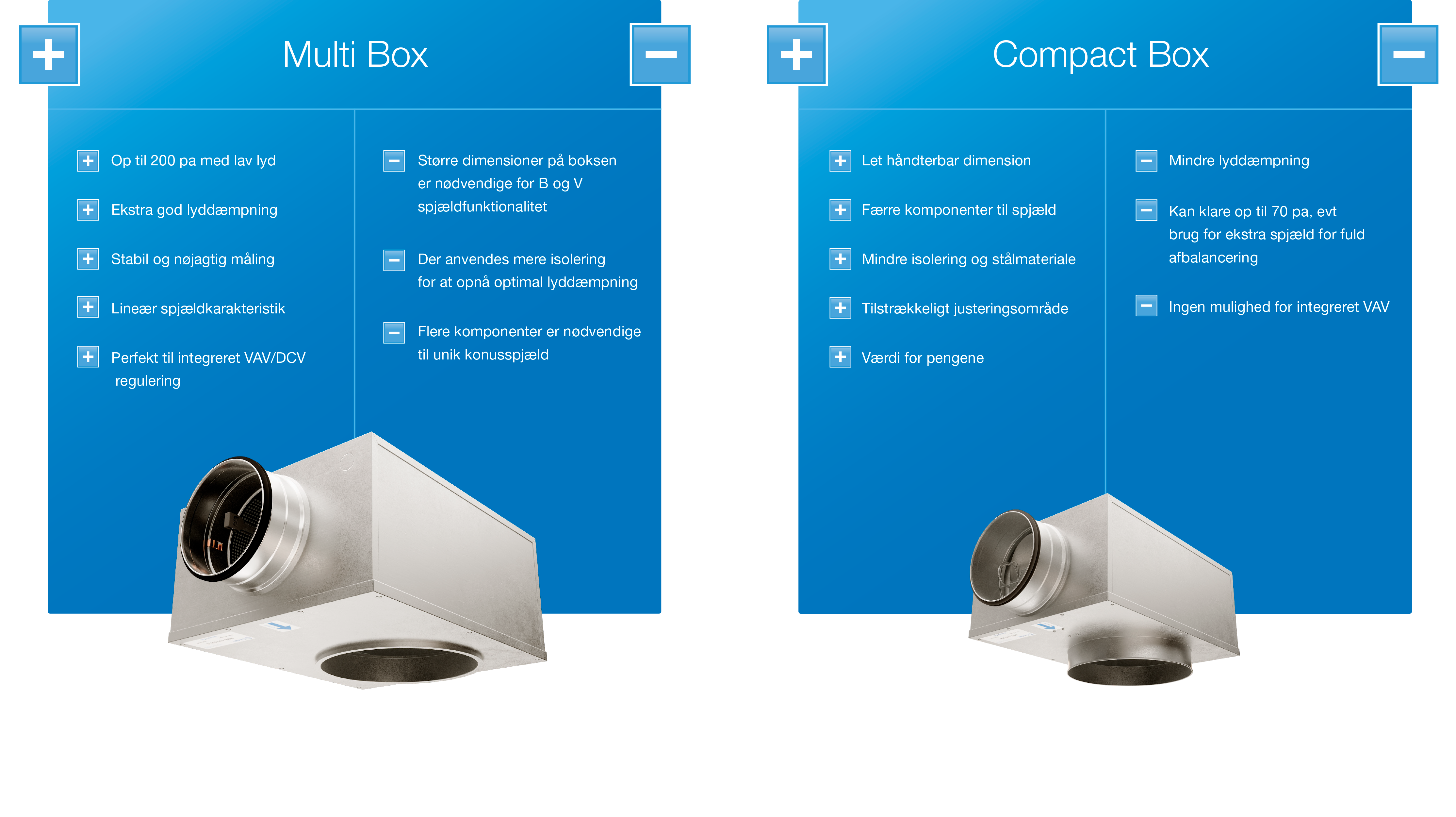 Når hverken plads, rum eller behov kræver den større og mere avancerede trykfordelingsboks, kan Compact Box være det rigtige valg. Compact Box er til områder, hvor du har behov for mindre boksdimensioner, hvor lyddæmpning ikke er nødvendig, hvor mindre lyddæmpende isolering er tilstrækkelig, og du ikke behøver en integreret VAV-løsning.