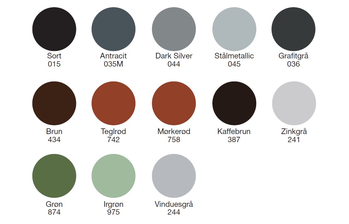 Sort, Antracit og Grafitgrå giver en skarp og moderne fremtoning, der passer til mange typer erhvervs- og boligbyggeri. Lysere nuancer som Antikhvid, Lysegrå og Gåsevingegrå skaber et roligt og elegant udtryk, som ofte bruges til facader, hvor arkitekturen skal fremstå let og velafbalanceret. De mere farvemættede varianter, som Armygrøn, Teglrød eller Mørkerød giver mulighed for at skabe karakter og varme i facadedesignet.
