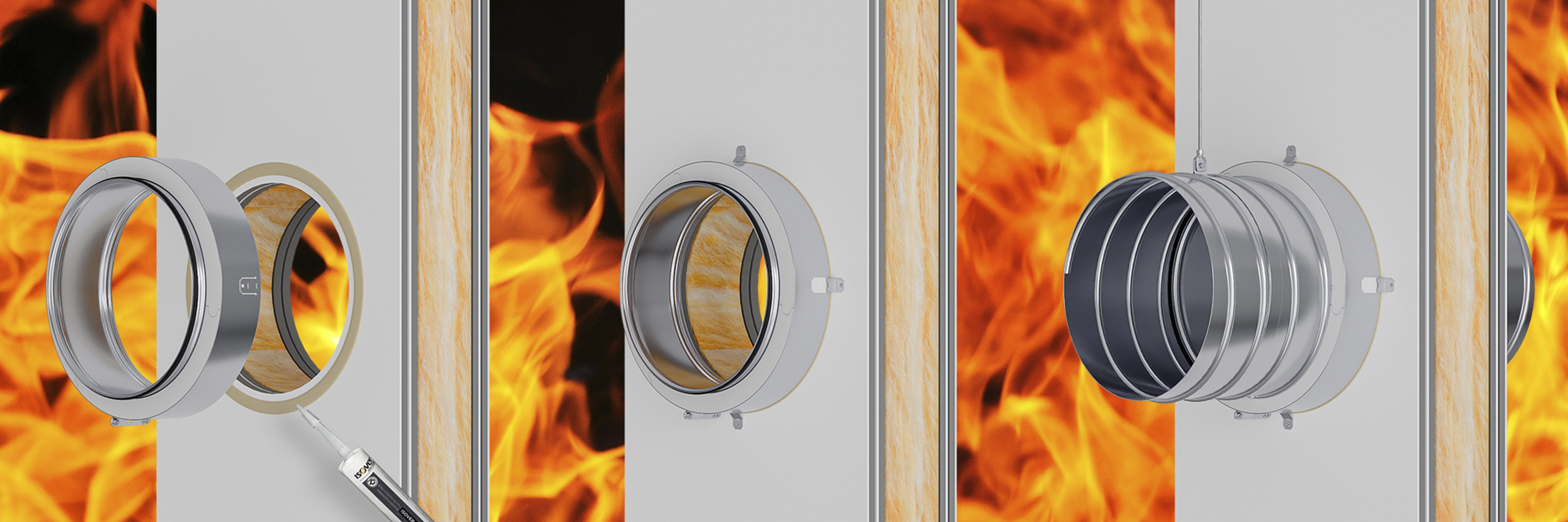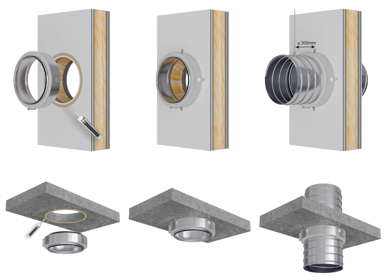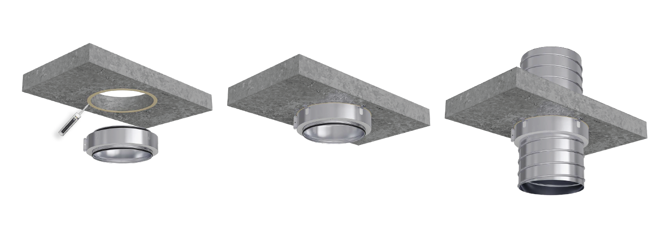 Når EKOCBG installeres, påføres først en brandhæmmende fuge omkring udsparingen. Derefter presses brandlukningen mod væggen, og de fire beslag foldes ud og fastgøres med universalskruer. Når installationen er færdig, kan ventilationskanalerne tilsluttes direkte. Det hele er beskrevet i en letforståelig montagevejledning, som gør det nemt at komme i gang – uanset erfaring.