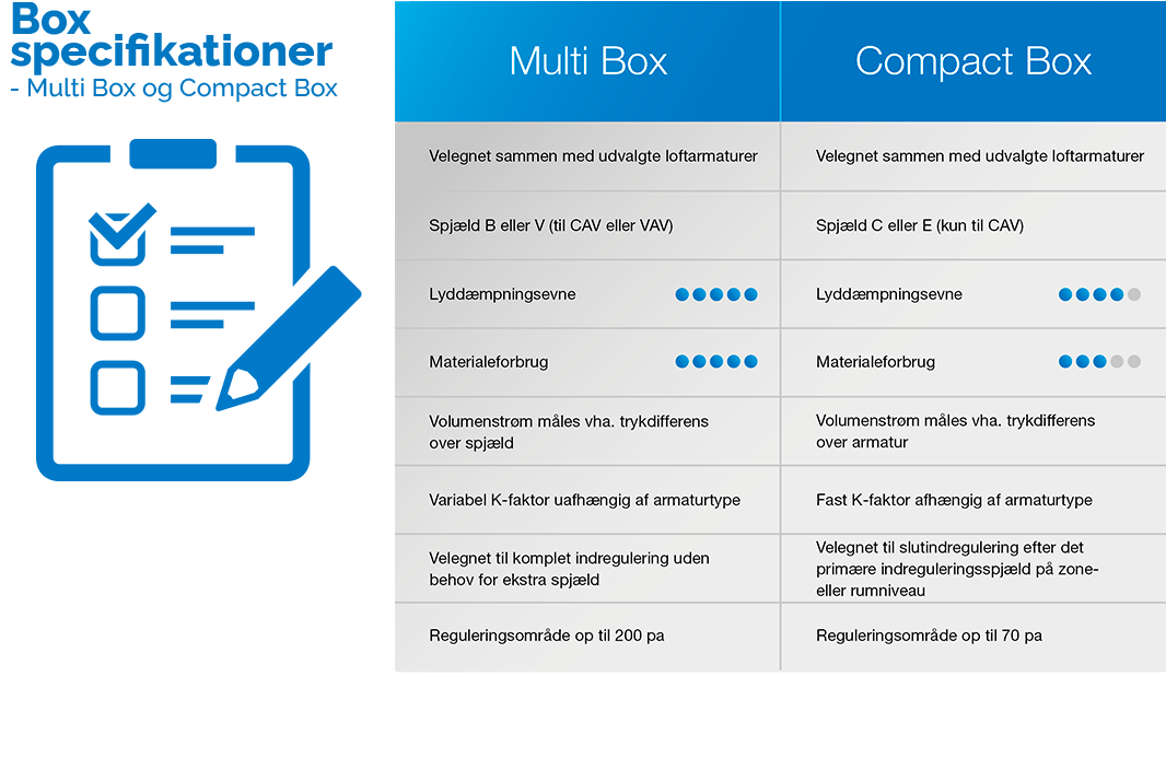 Når hverken plads, rum eller behov kræver den større og mere avancerede trykfordelingsboks, kan Compact Box være det rigtige valg. Compact Box er til områder, hvor du har behov for mindre boksdimensioner, hvor lyddæmpning ikke er nødvendig, hvor mindre lyddæmpende isolering er tilstrækkelig, og du ikke behøver en integreret VAV-løsning.