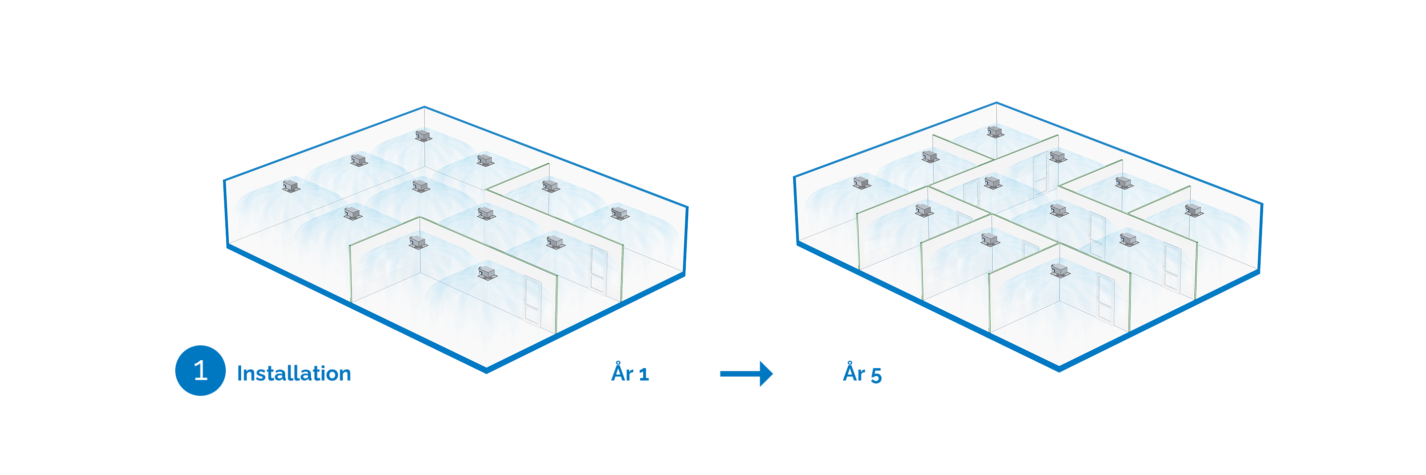 Når der opstår nye krav, kan du nemt ændre designet uden at have ekstra installationsomkostninger. Du behøver ikke tænke på sensorer, kanalarbejde eller rumcontrollere, når du redesigner dit kontormiljø.