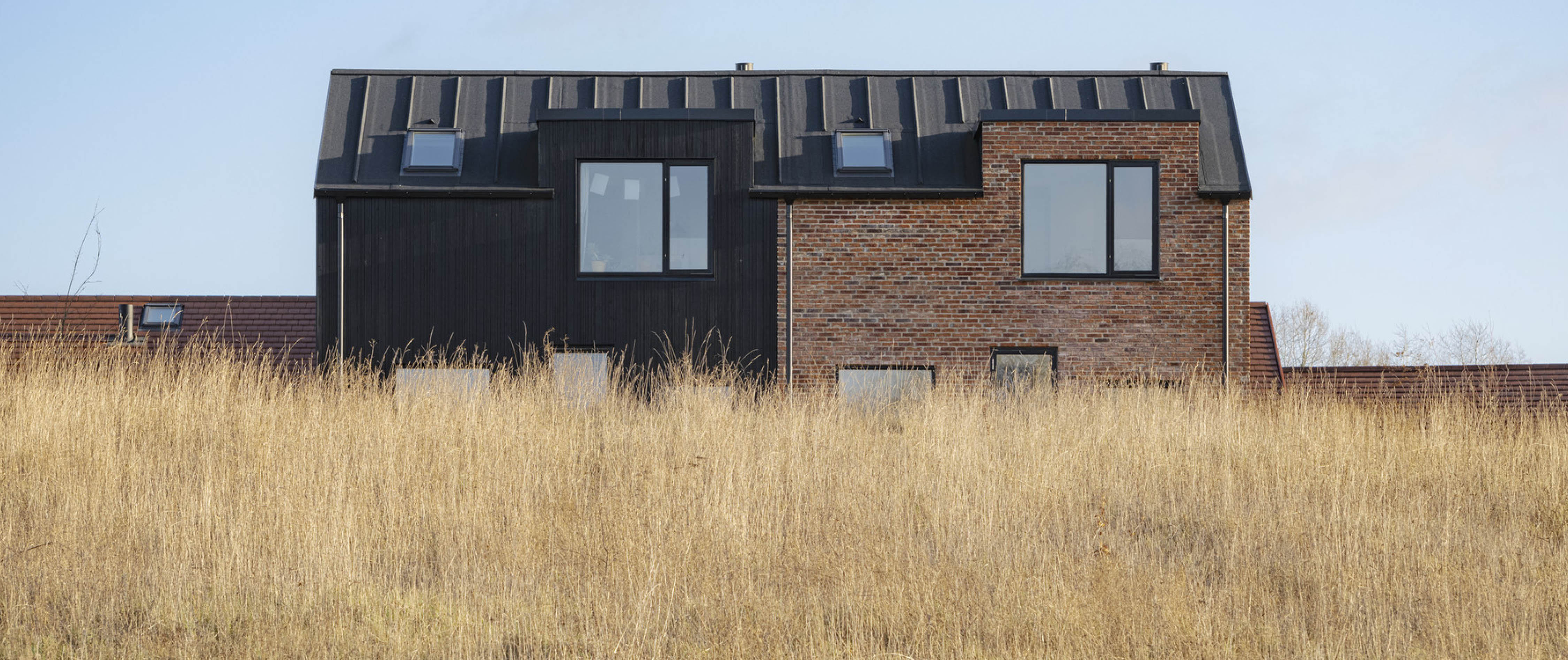 | Projektet arbejder bevidst med farvesætning og form –og derfor blev Lindab Rainline valgt. Det var den eneste leverandør, der kunne levere tagflader, tagrender og beslag i samme præcise farve, hvilket var afgørende for at skabe det ønskede stramme, grafiske udtryk. Samtidig bød Rainline på et kliksystem, som entreprenøren gerne ville arbejde med og en overfladebehandling, der understøttede kravene til holdbarhed og bæredygtighed. | Løsningen integrerer æstetisk og funktionelt med byggeriets arkitektur. Regnvand håndteres lokalt, og alt regnvand på terræn forbliver på grunden via grøfter og fordrøjningsløsninger. Tagvand føres kontrolleret til regnvandsledning –i respekt for både lokalplan og miljøhensyn. Regnvandshåndteringen er en diskret, men vigtig del af helheden –og valget af Rainline har bidraget til en visuel sammenhæng og teknisk kvalitet. |