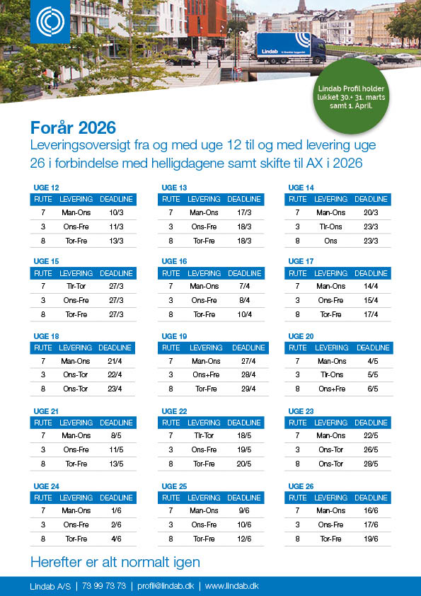 Bemærk venligst, at Lindab Profil holder lukket den 30. og 31. marts samt den 1. april. I disse dage leverer vi ikke, og bestillingsfristerne kan derfor være justeret i de berørte uger.
