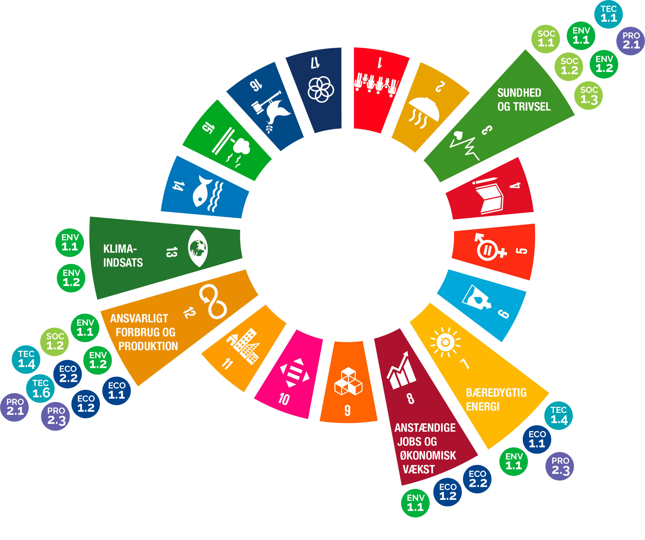 Derfor anvender vi FN’s verdensmål som grundlag for en lang række af vores beslutninger. Vi har valgt at fokusere på Verdensmål 3 (Sundhed og trivsel), 4 (Kvalitetsuddannelse), 7 (Bæredygtig energi), 8 (Anstændige jobs og økonomisk vækst), 12 (Ansvarligt forbrug og produktion), 13 (Klimaindsats) og 17 (Partnerskaber for handling).