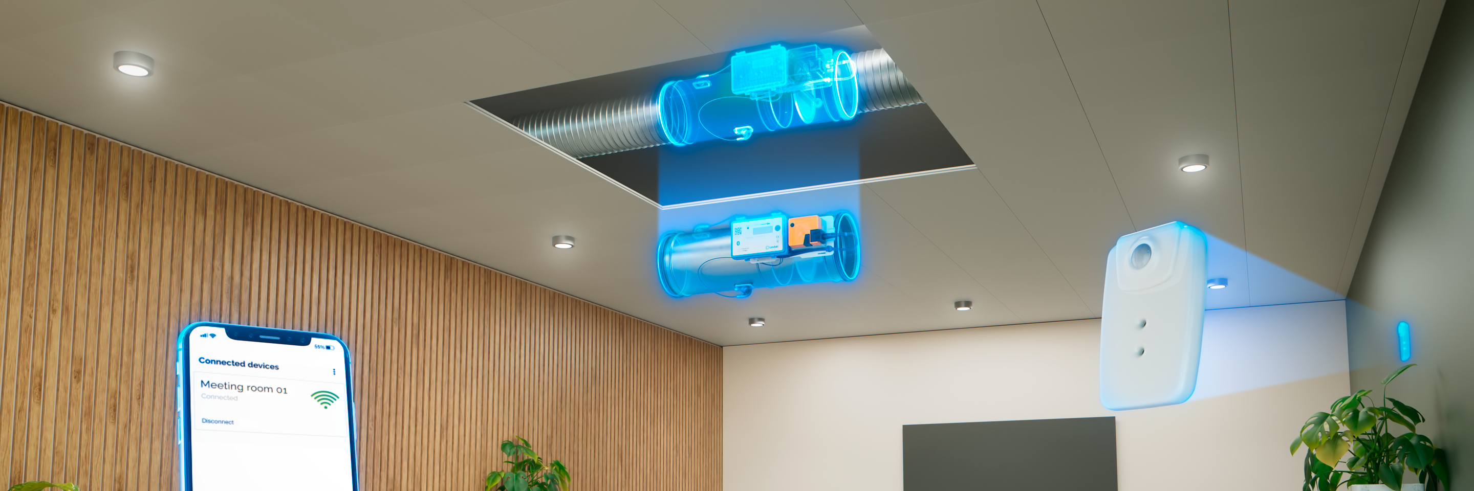 UltraLink DCV regulator, Bluetooth sensorer og Lindab-apps på din smartphone – det er alt hvad du behøver for at få en omkostningseffektiv ventilationsopgradering med fuld driftskontrol på rumniveau.